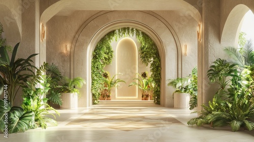 Spacious beige room with arched entrance and greenery, designed with computer graphics.