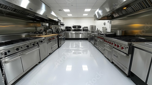Spacious commercial kitchen with stainless steel appliances and equipment.