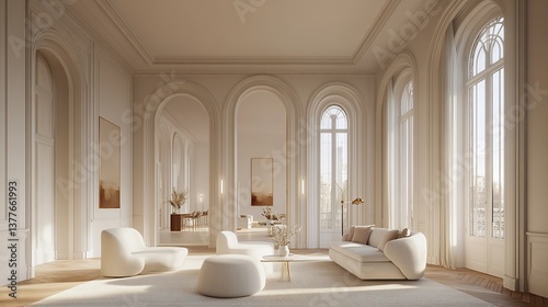 Spacious, light-filled interior with arches and large windows. Modern, minimalist design