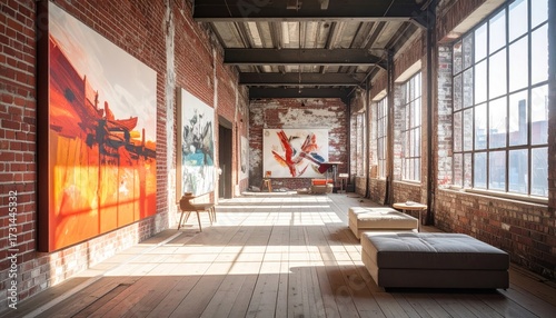 Spacious loft apartment with exposed brick walls, art displays and natural light ambiance interior