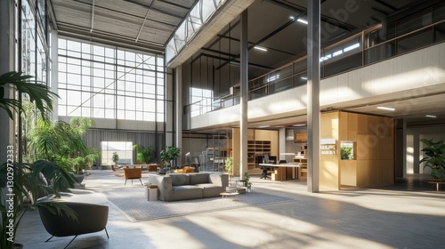 Spacious modern office building with indoor plants.