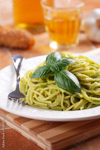 spaghetti al pesto con foglia di basilico