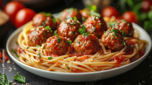 spaghetti and beef meatballs with tomato sauce in white dish isolated,cartoon illustration style