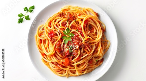 spaghetti pasta with tomato beef sauce on white plate top view on white background