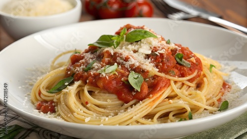 Spaghetti pasta with tomato sauce, mozzarella cheese and fresh basil in plate on white wooden background. Selective focus.