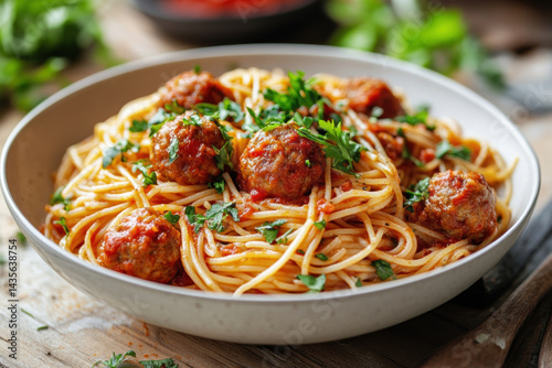 Spaghetti with meatballs and tomato sauce on a white plate, garnished with parmesan cheese and fresh basil leaves.