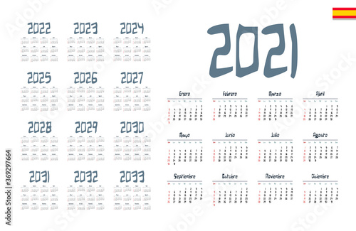 Spanish calendar 2021 - 2033 on white background, week starts on Sunday