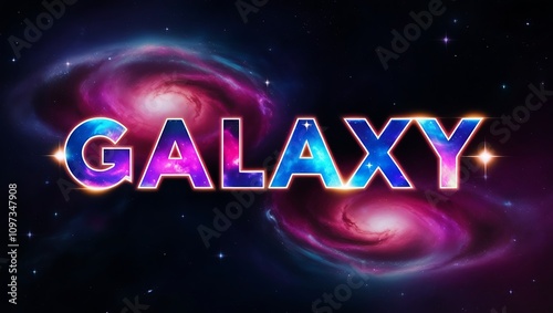 Sparkling cosmic word "Galaxy" set against a backdrop of two swirling nebulae.