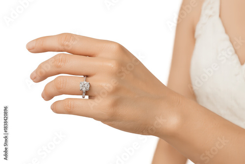 Sparkling diamond ring on woman's hand, isolated on transparent background.