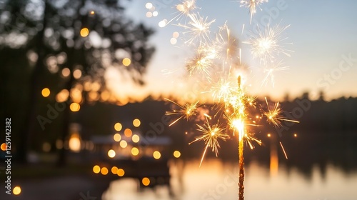 Sparkling Fireworks Over Calm Water at Sunset Creating Magical Bokeh Effect : Generative AI
