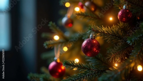 Sparkling lights illuminate the branches of a tall Christmas tree, Christmas Tree,