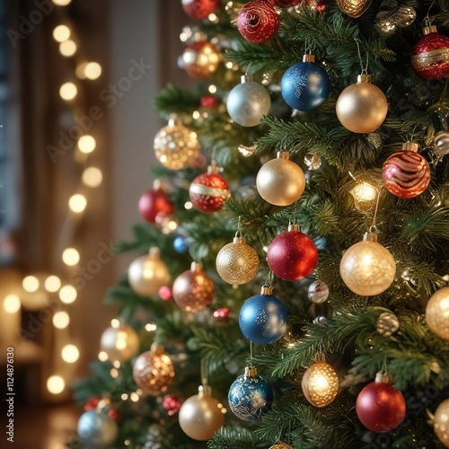 Sparkling ornaments on a Christmas tree decorated with lights and garlands, sparkling ornaments, twinkling fairy lights, festive lights