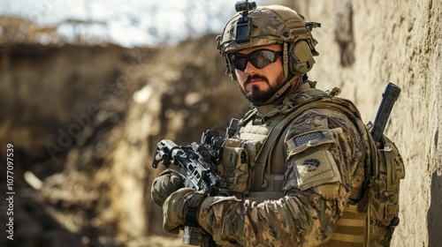Special forces soldier in full uniform poses in studio background wallpaper AI generated image