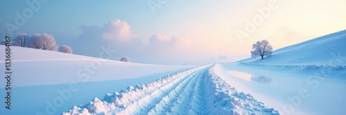Speckled snowy landscape with a winding path and a few trees in the distance,, mist, path