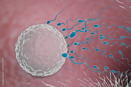 Sperm swimming towards the Ovum in a fallopian tube. 3D Illustration Rendering.