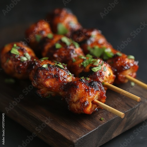 Spicy chicken lollipop, rustic board, black background.