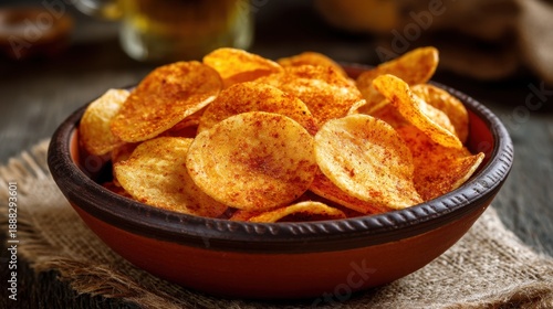Spicy seasoned potato chips in rustic bowl on wooden table.