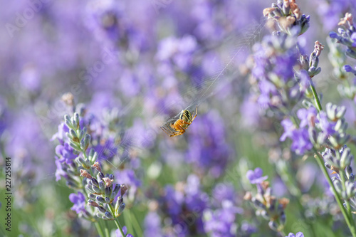 Spider on lavender flowers in sunny day
