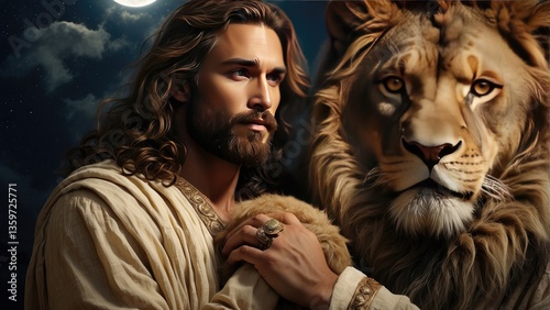 "Spiritual Art: Jesus and the Lion of Judah Religious Portrait on Black Background"