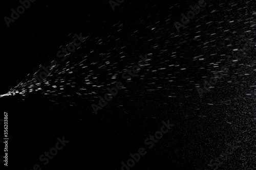 Splash water liquid background. Mist spray aerosol bottle for perfume isolated on black.