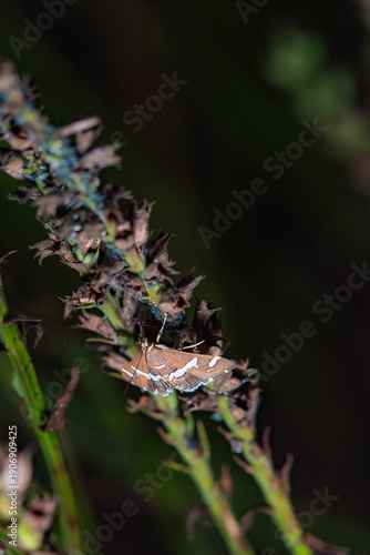 Spoladea recurvalis perches on withered flower stems.