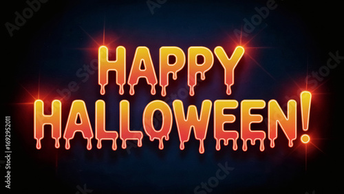 Spooky dripping orange text announces Happy Halloween with glowing effects and dark background