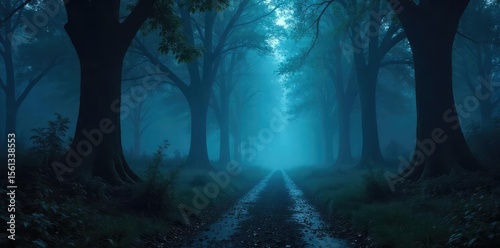 Spooky Forest Path at Night Mysterious Mist, Ominous Shadows, Perfect for Halloween, Horror, Fantasy, Game Assets, and Book Covers