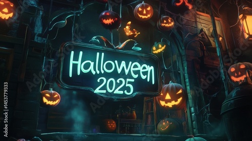Spooky Halloween 2025 sign with illuminated jack-o'-lanterns.