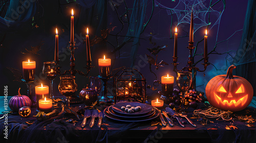 Spooky Halloween Dinner Table with Candles and Jack-o'-Lantern in Dark Setting