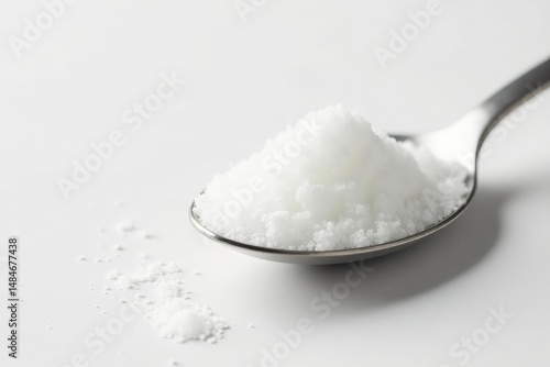 Spoonful of white sugar against white backdrop, tabletop, particles, sweetener