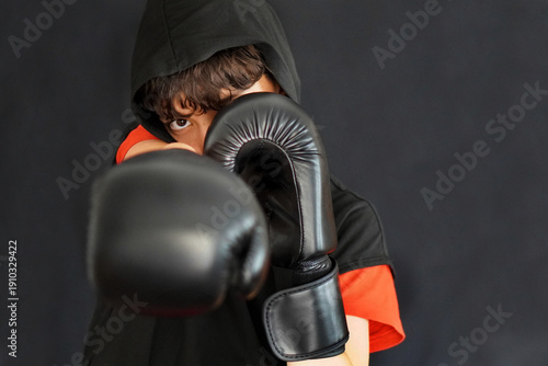 Sports, martial arts for children. Preteen boy with boxing gloves against a black background