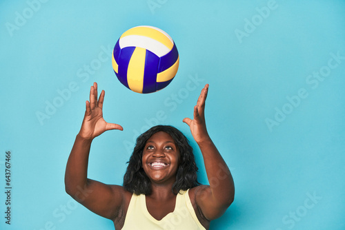 Sporty curvy woman practicing volleyball serves on blue backdrop