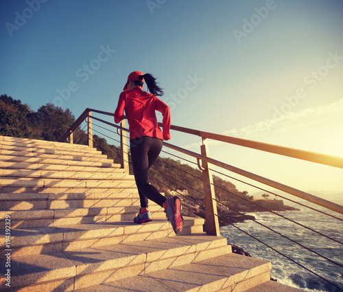 sporty female runner running upstairs on coast trail