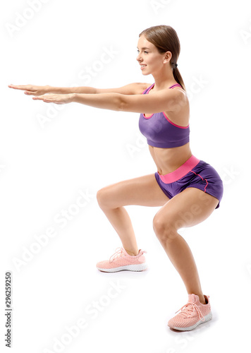 Sporty young woman training against white background