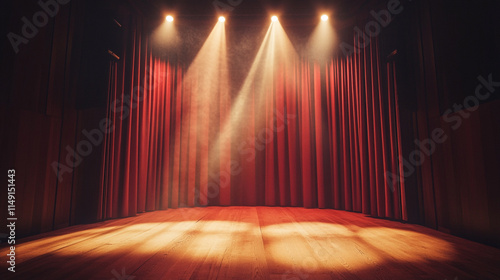 Spotlights illuminate an empty stage in a theater before a performance begins.
