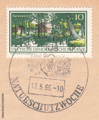 Spreewald-forest on the Spree river, national park. Postmark nature conservation week, Berlin, stamp Germany 1966