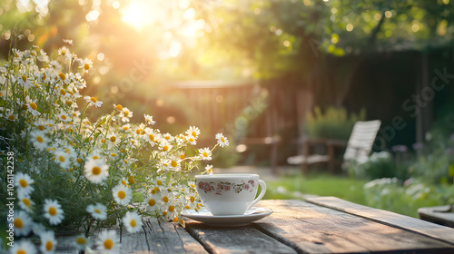 Spring - Chamomile Flowers In Teacup On Wooden Table In Garden