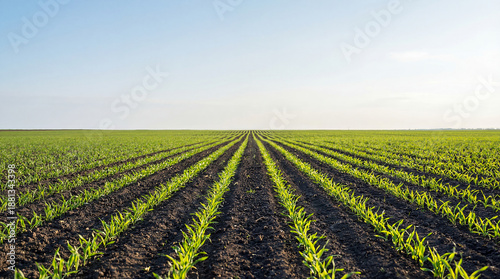 Spring Agricultural Field with Even Crop Rows Under Clear Sky