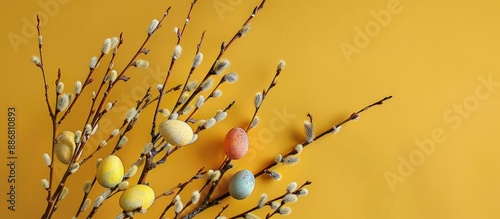 Spring and Easter concept featuring pussy-willow twigs adorned with Easter eggs set against a yellow backdrop, ideal for copy space image.