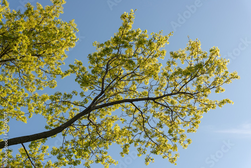 spring branch with new foliage on a blue sky