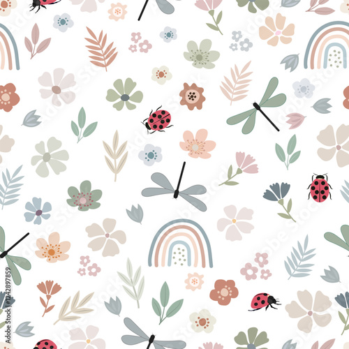 Spring garden, nature, rainbow, flowers, dragonfly, ladybug, seamless pattern
