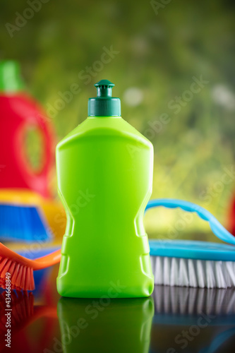 Spring house and office cleaning. Cleaning kit and sources on the glass table. Bokeh background.