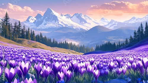 Spring mountain landscape with violet crocuses blooming on the meadow