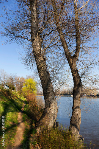 Spring old Trees above the River Vltava in the sunny Day, Prague, Czech Republic