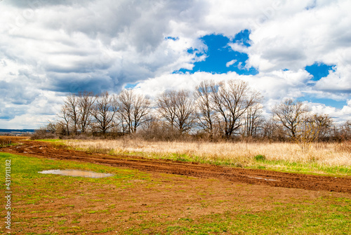 Spring rural lanscape, road, trees and sky