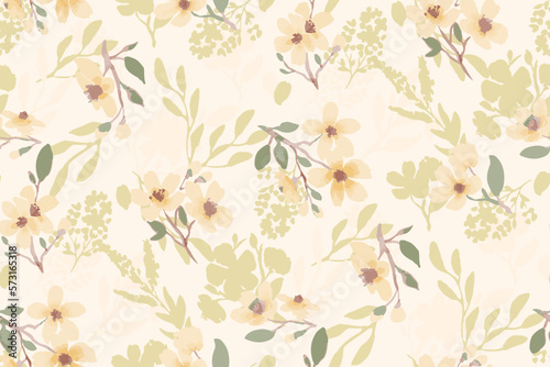 Spring summer green delicate seamless pattern with blooming apple tree or sakura.