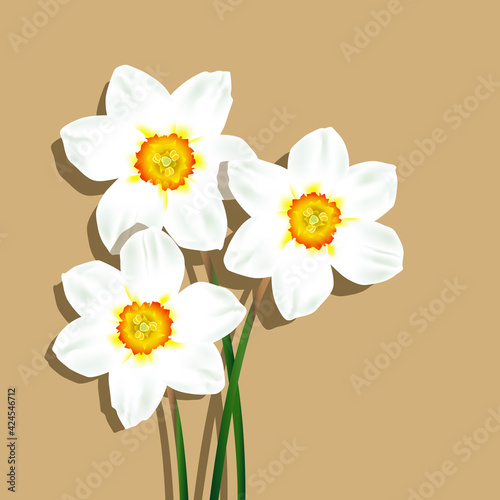 Springtime growing daffodils on beige background. Blooming flowers for mothers day. Botanical floral vector illustration.