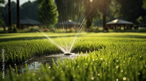 Sprinkler Dances over Verdant Park Grass in Refreshing Spray. Generative AI
