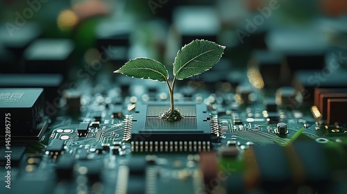Sprout growing from circuit board with colorful blurred lights.