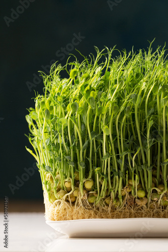 Sprouted pea sprouts, microgreens in a white rectangular plate on a white table, close-up